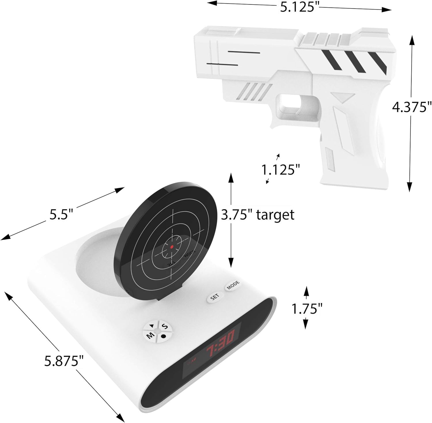 When the alarm goes off, the gun o'clock target pops up, and you have to grab the gun in time to shoot it to turn the clock off! This revolutionary alarm clock will improve the caliber of your sleep. The alarm will ring for 3 minutes continuously and then enter into snooze mode. The gun target alarm clock changes things by waking you up with an alarm that is shut down by shooting the target with the accompanying gun. With this gun target alarm clock you can just set the clock to wake you up when you want. This gun target alarm clock might do the trick. Did you scroll all this way to get facts about gun target alarm clock? With the gun and target alarm clock you just blast the bullseye to earn 5 extra minutes of snooze. The clock will go to snooze mode once you shoot it with the included gun. It also has 2 game modes for when you're not in the sleeping mode if you just want to get some practice in before the big wake up. Magical, meaningful items you can't find anywhere else. And you can record your own alarm sound too. The target doesn't always pop up and we had to remove the.